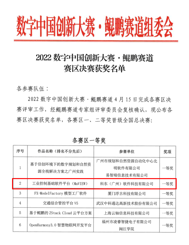 目前,“2022數(shù)字中國創(chuàng)新大賽.鯤鵬賽道”的部分獎項已揭曉,東土科技旗下子公司——科東(廣州)軟件科技有限公司(以下簡稱科東軟件)憑借“工業(yè)控制基礎(chǔ)平臺MaVIEW”榮獲華南賽區(qū)一等獎,并成功晉級全國總決賽。