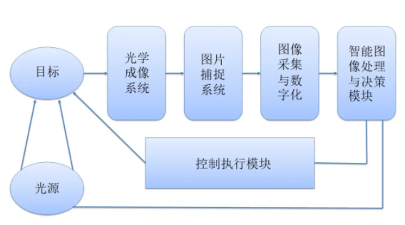 機(jī)器視覺(jué)即用機(jī)器代替人眼來(lái)做測(cè)量和判斷,工作流程大致為:被攝取目標(biāo)——經(jīng)圖像攝取裝臵——圖像信號(hào)——經(jīng)圖像處理系統(tǒng)——數(shù)字信號(hào)——經(jīng)抽取目標(biāo)特征——判斷結(jié)果并控制設(shè)備。該流程的實(shí)現(xiàn)需相應(yīng)的硬件作為基礎(chǔ),典型的工業(yè)機(jī)器視覺(jué)系統(tǒng)構(gòu)成有照明、鏡頭、相機(jī)、圖像采集卡、視覺(jué)處理器等。