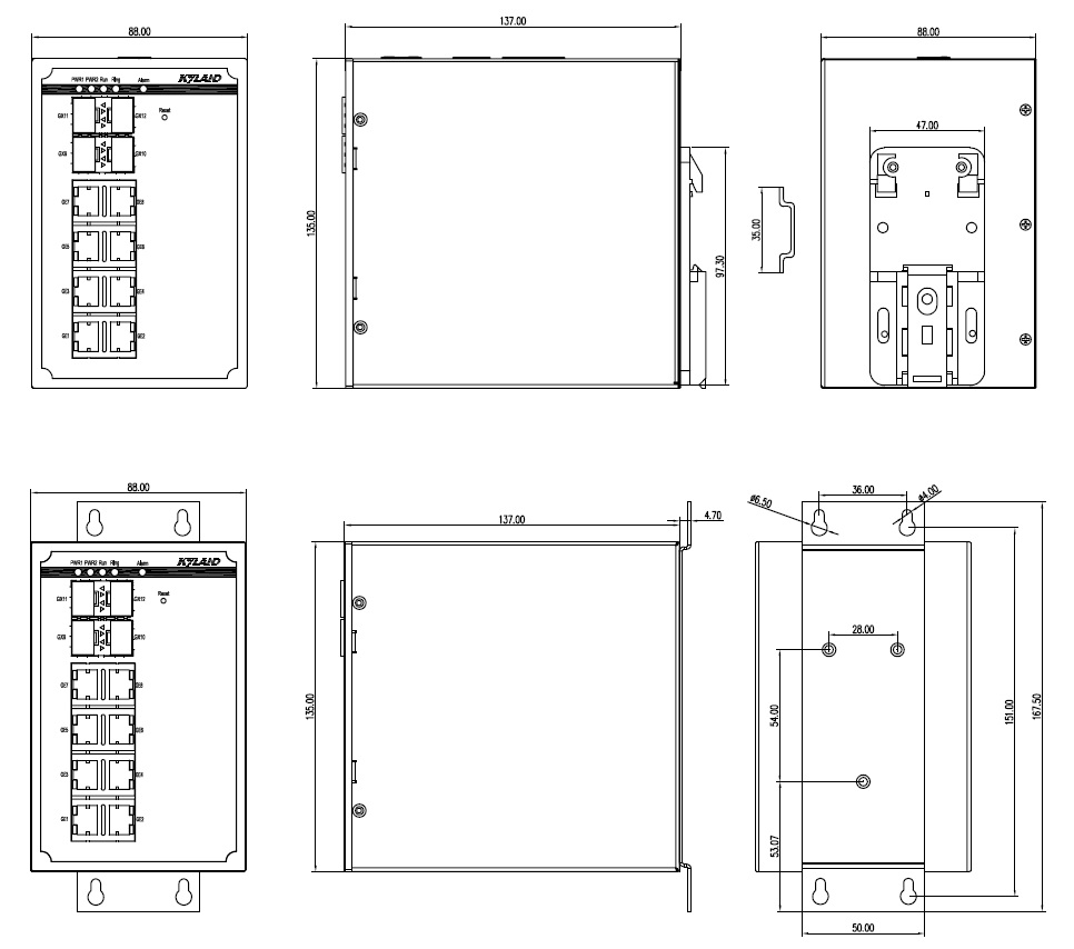 88mm×135mm×137mm(W×H×D): 8GE=8×10/100/1000Base-T(X) RJ45電口 2GX8GE=2×100Base-X, 1000Base-X, 10/100/1000Base-T(X) SFP接口; 8×10/100/1000Base-T(X) RJ45電口 4GX8GE=4×100Base-X, 1000Base-X, 10/100/1000Base-T(X) SFP接口; 8×10/100/1000Base-T(X) RJ45電口